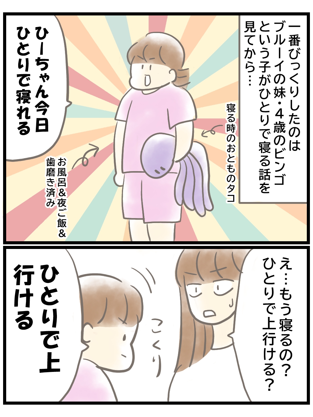 ビンゴが寝るときに「赤ちゃんじゃないから1人で寝る」と言い出すお話。