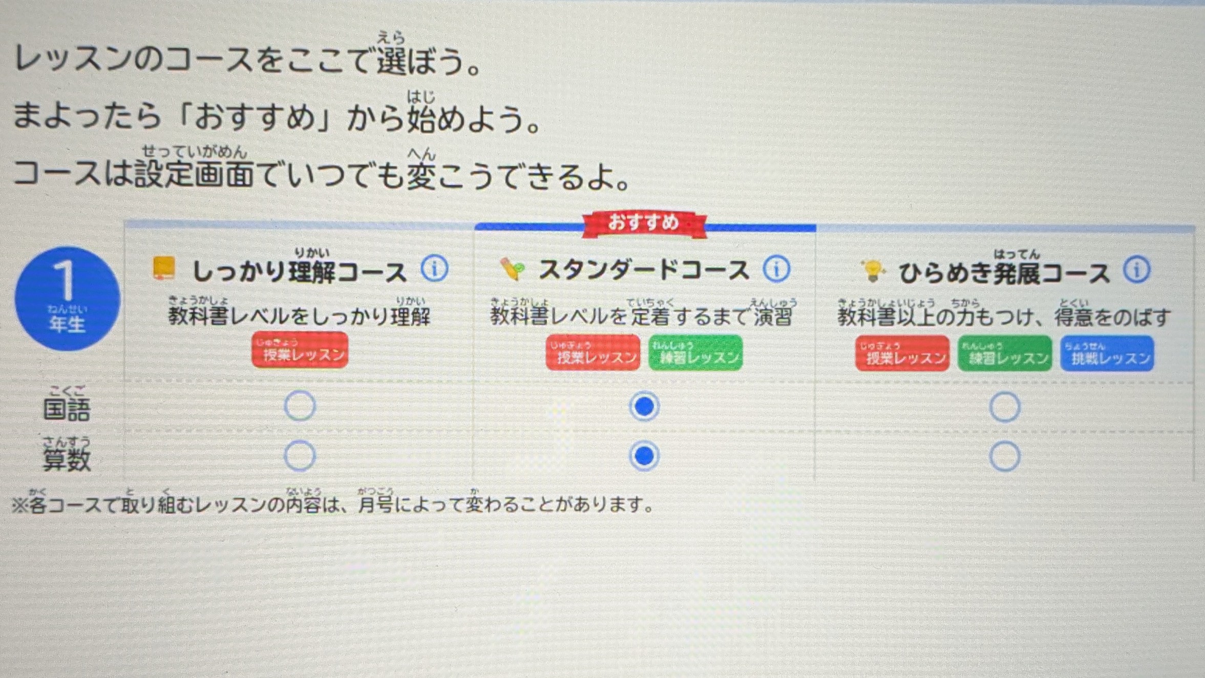 我が家は「スタンダードコース」を選んだので、1日3レッスン(約15分)と、年長コースのときとほぼ変わらないボリュームでスタートできました。