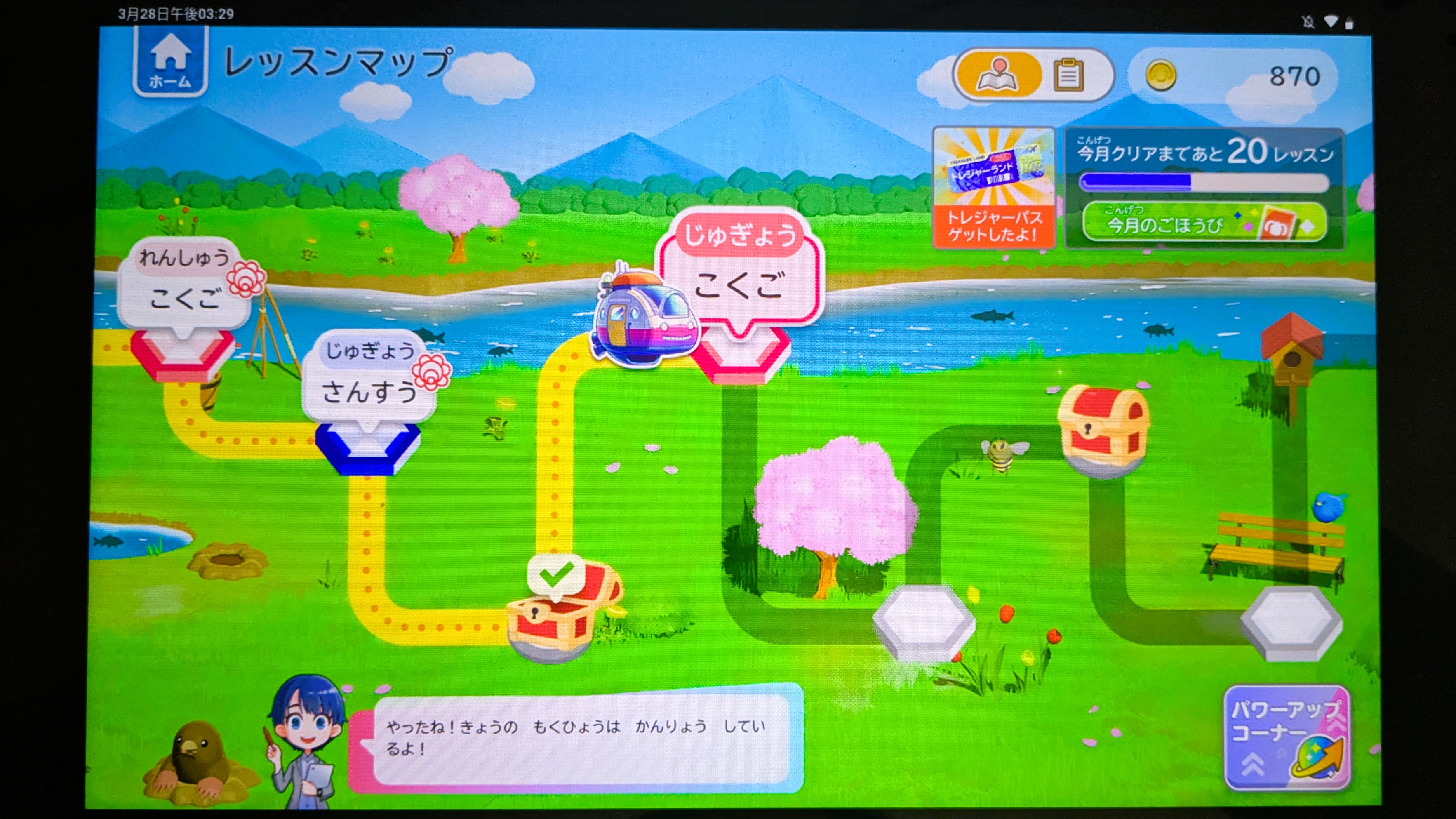 マップの最後には金の宝箱があり、そこを目指して毎月レッスンを頑張れる仕組みです。
