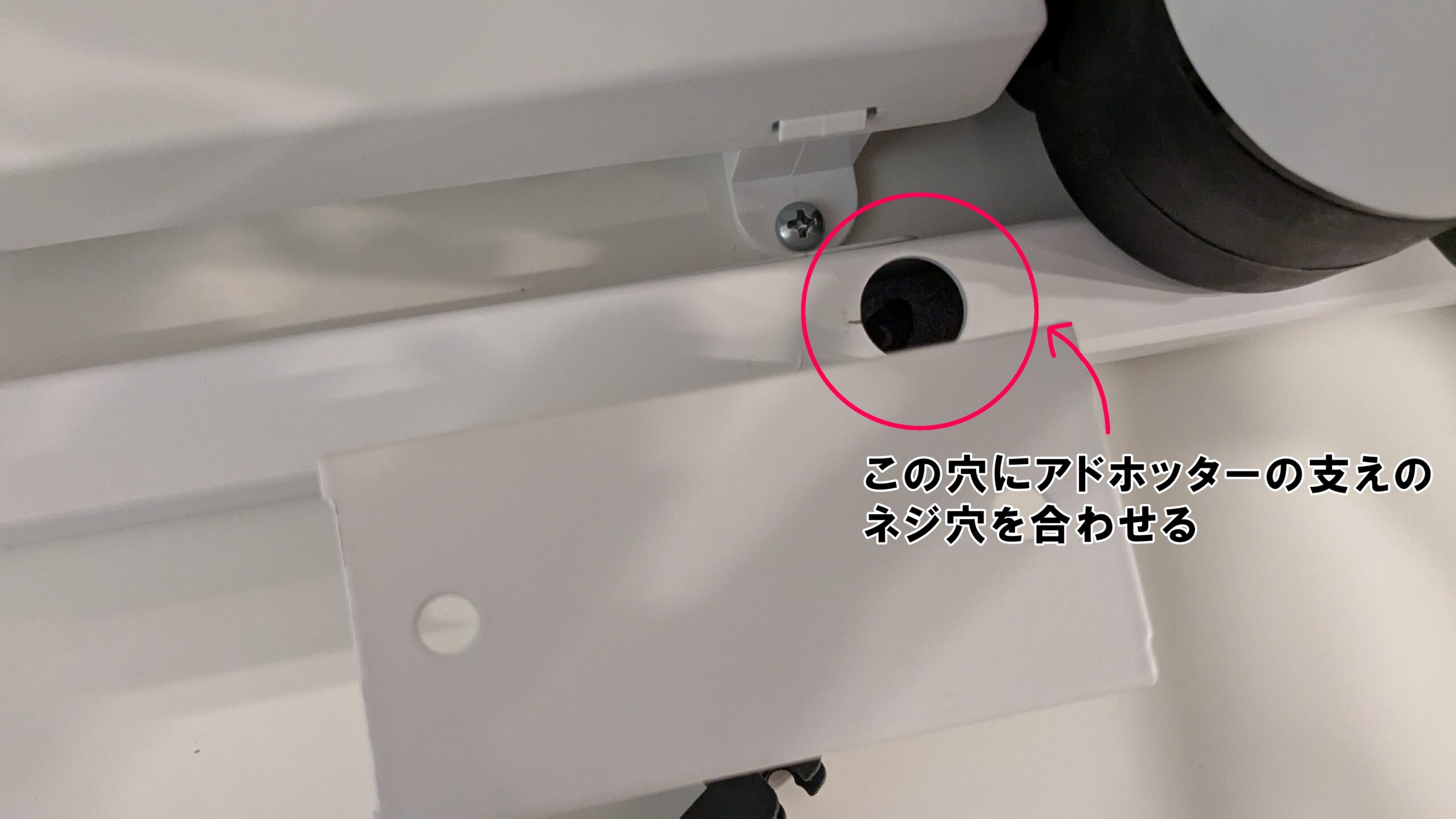 写真にもある通り、穴の位置とアドホッターの支えのネジ穴の位置を合わせます。