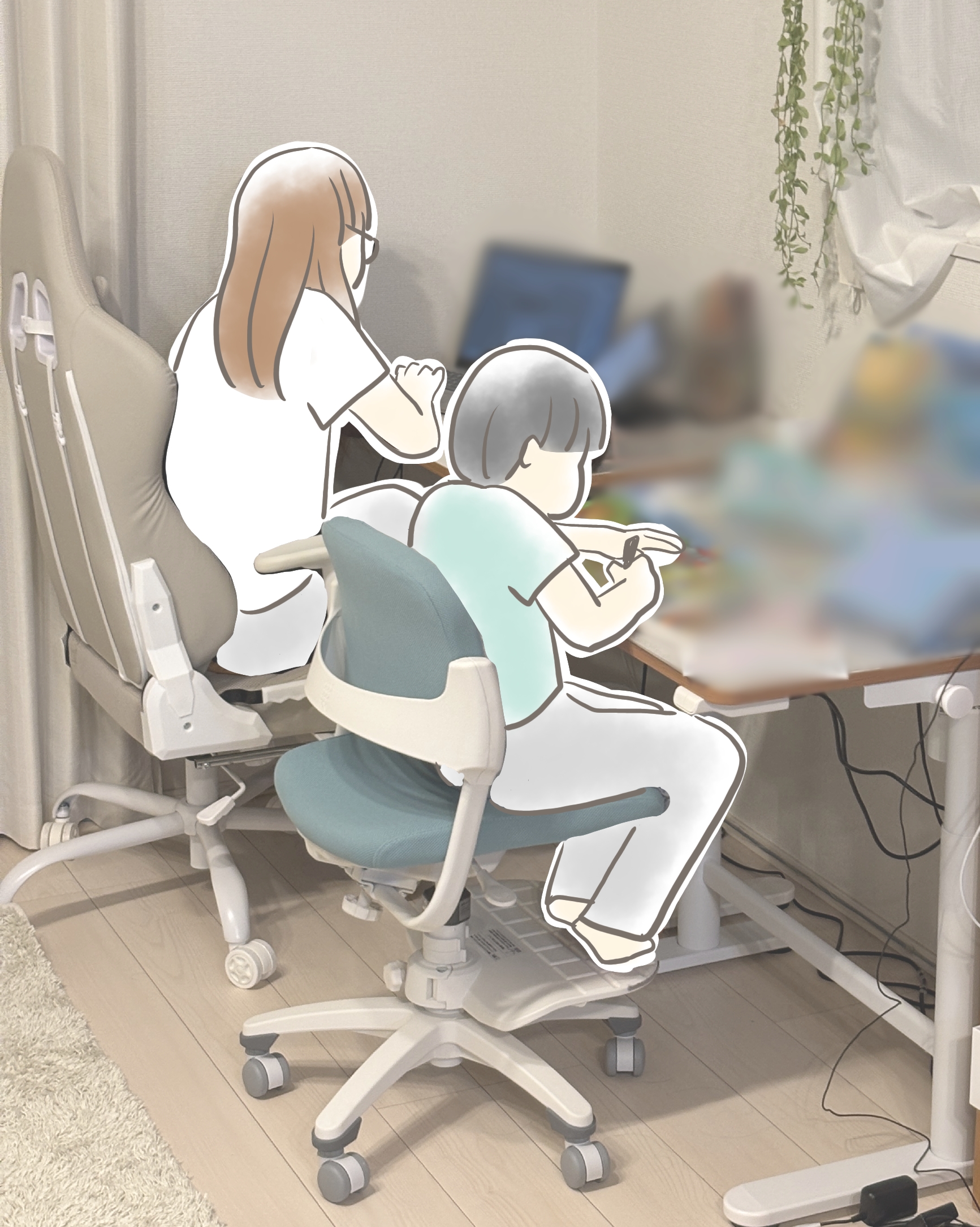 姿勢が安定すると、驚くほど集中しやすくなります。「足がしっかりつく」「前かがみになりすぎない」だけで、落ち着きが変わりました◎ - 親も同じデスクで一緒に作業する