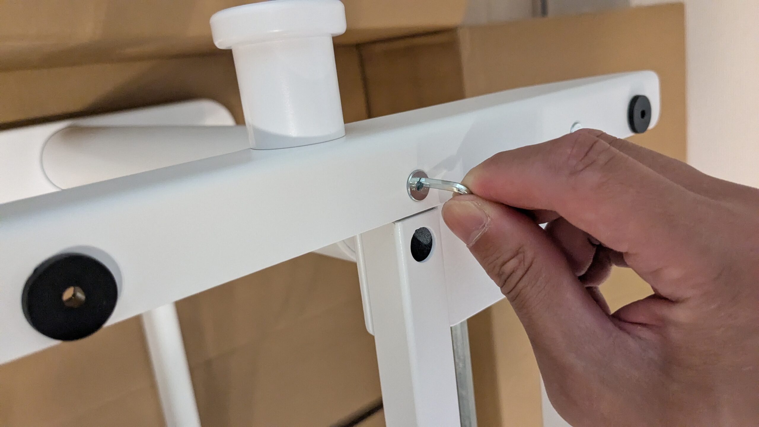 まずは支柱をひっくり返し、脚をレンチで取り付けます。