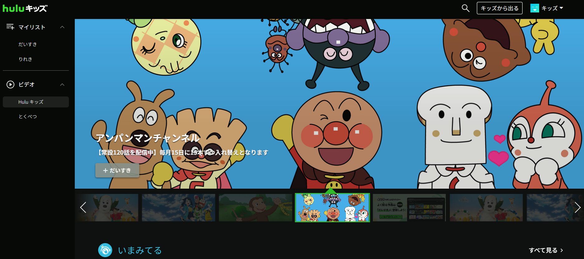 Huluの「キッズモード」では、子ども向けの安全な作品だけが表示されます。