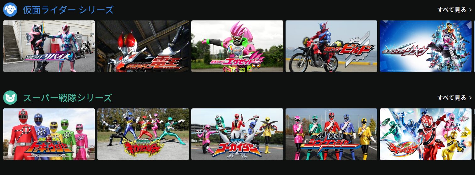 Huluキッズでは、「アンパンマンシリーズ」「虫シリーズ」「乗り物・はたらくくるまシリーズ」など、ジャンルごとにカテゴリ分けされたサムネイルメニューになっています。