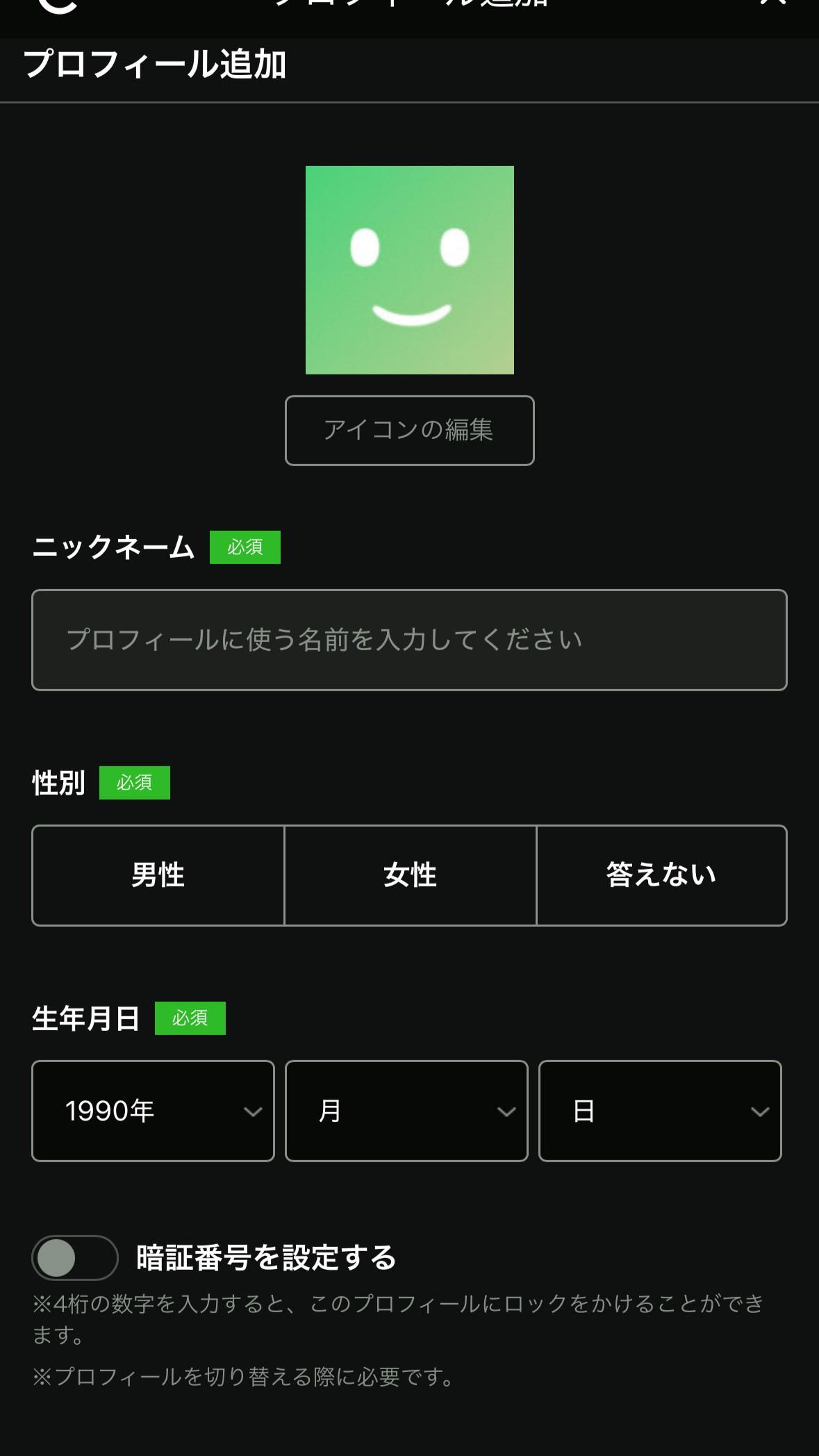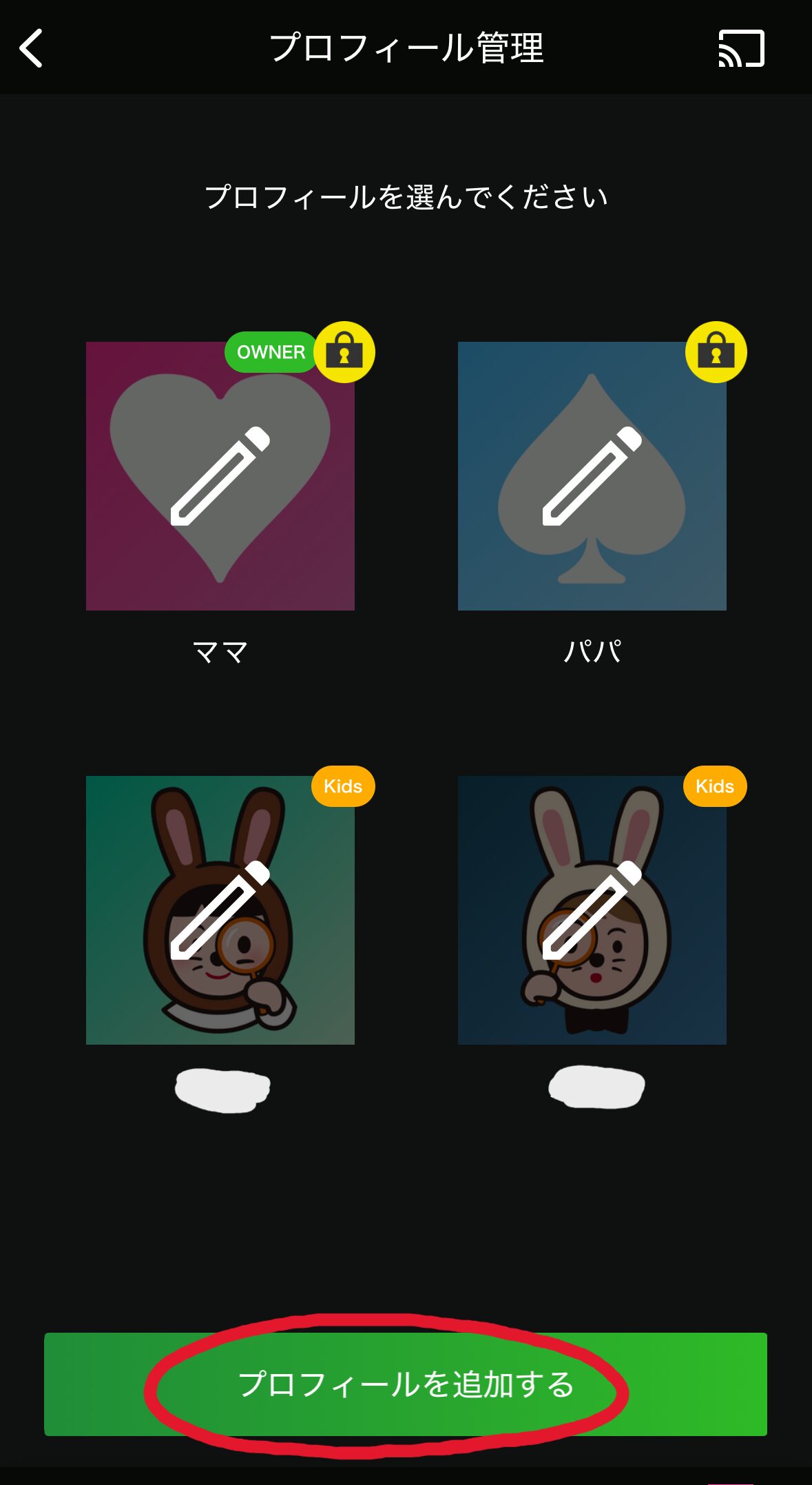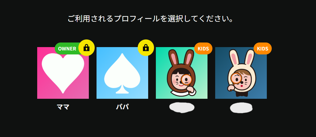 プロフィール画面を選ぶとき、親のアカウントには暗証番号でロックをかけることが可能。