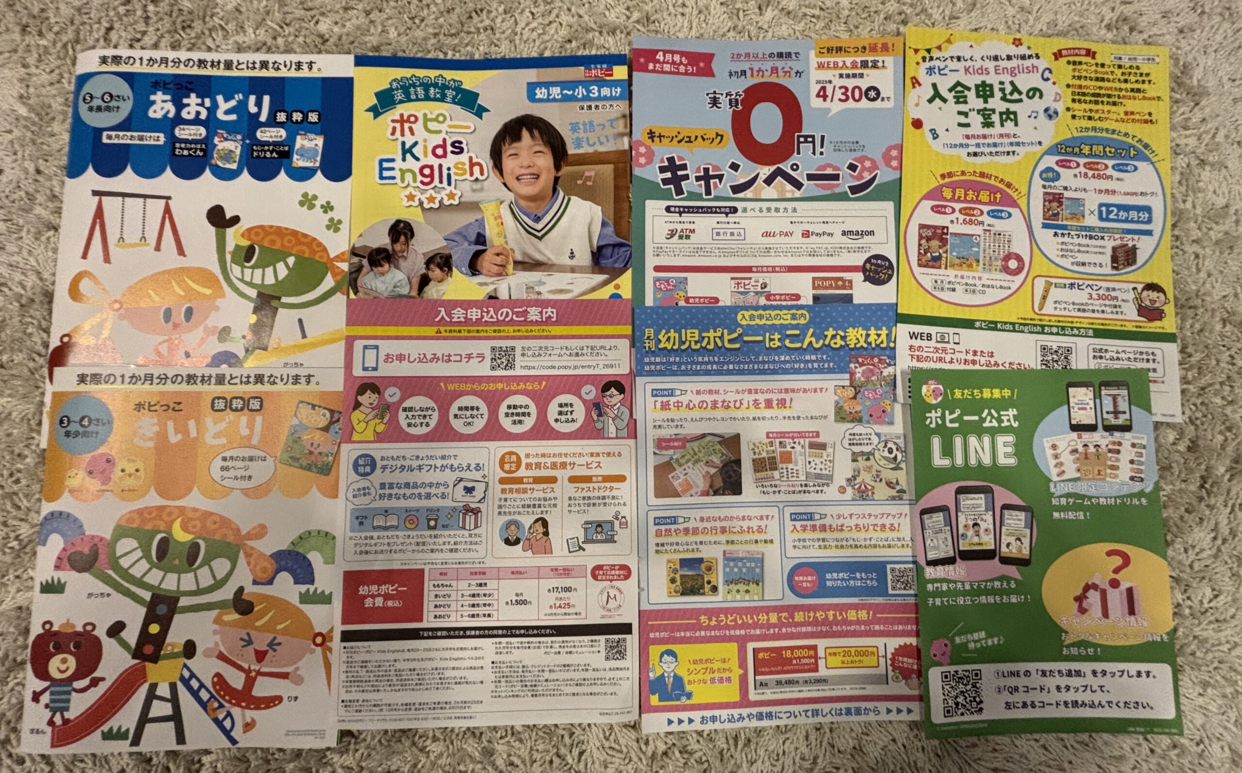 資料請求したのは、年長さん(5~6歳)向けの「あおどり」、年少さん(3~4歳)向けの「きいどり」、そして「ポピーKids English」の3種類です。