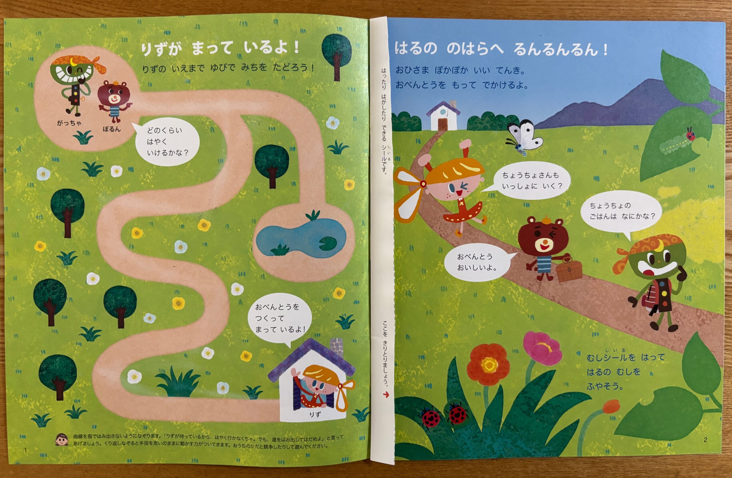 教材をめくると、まず目に入るのは子どもが大好きな迷路やシール遊び!