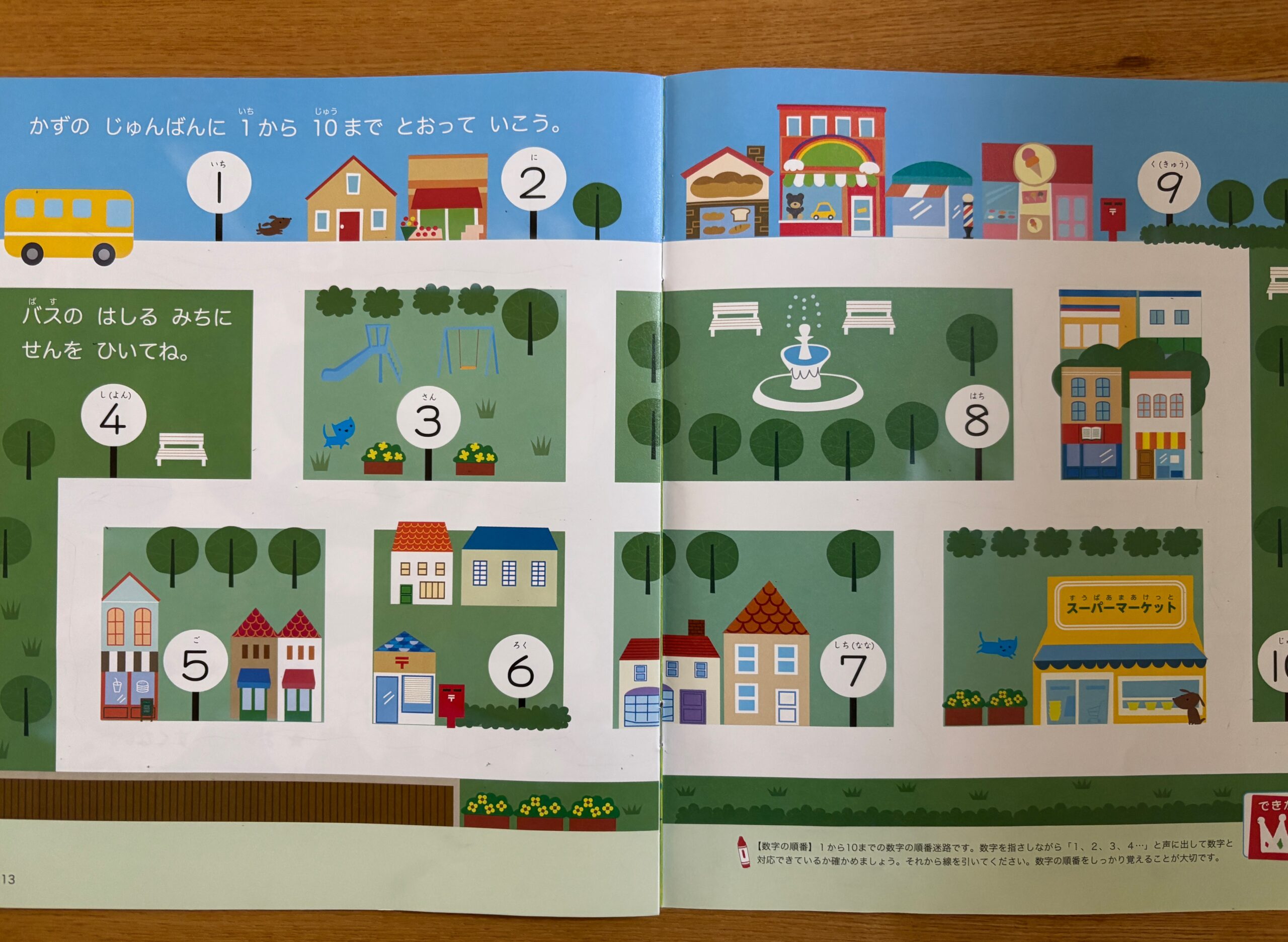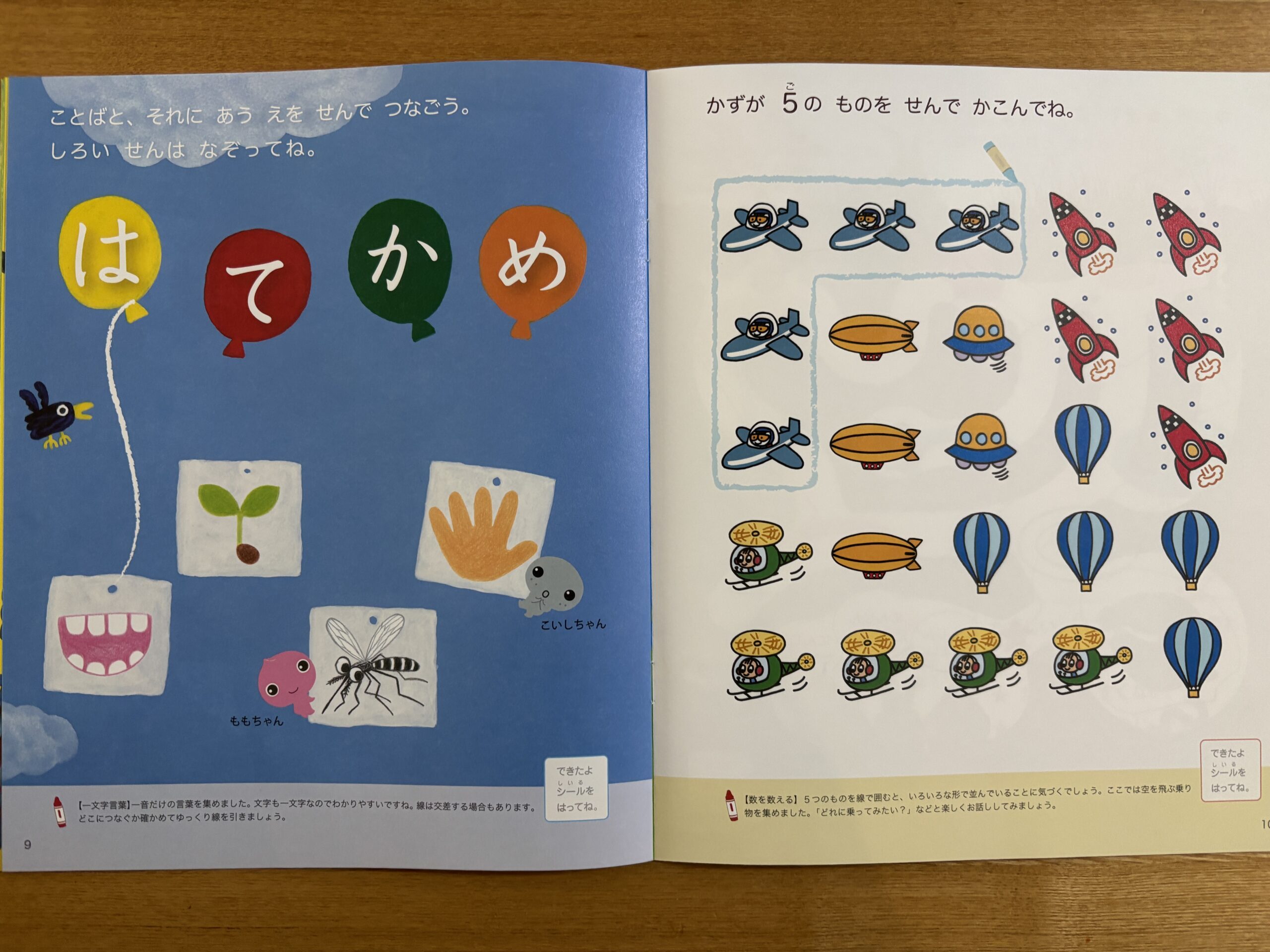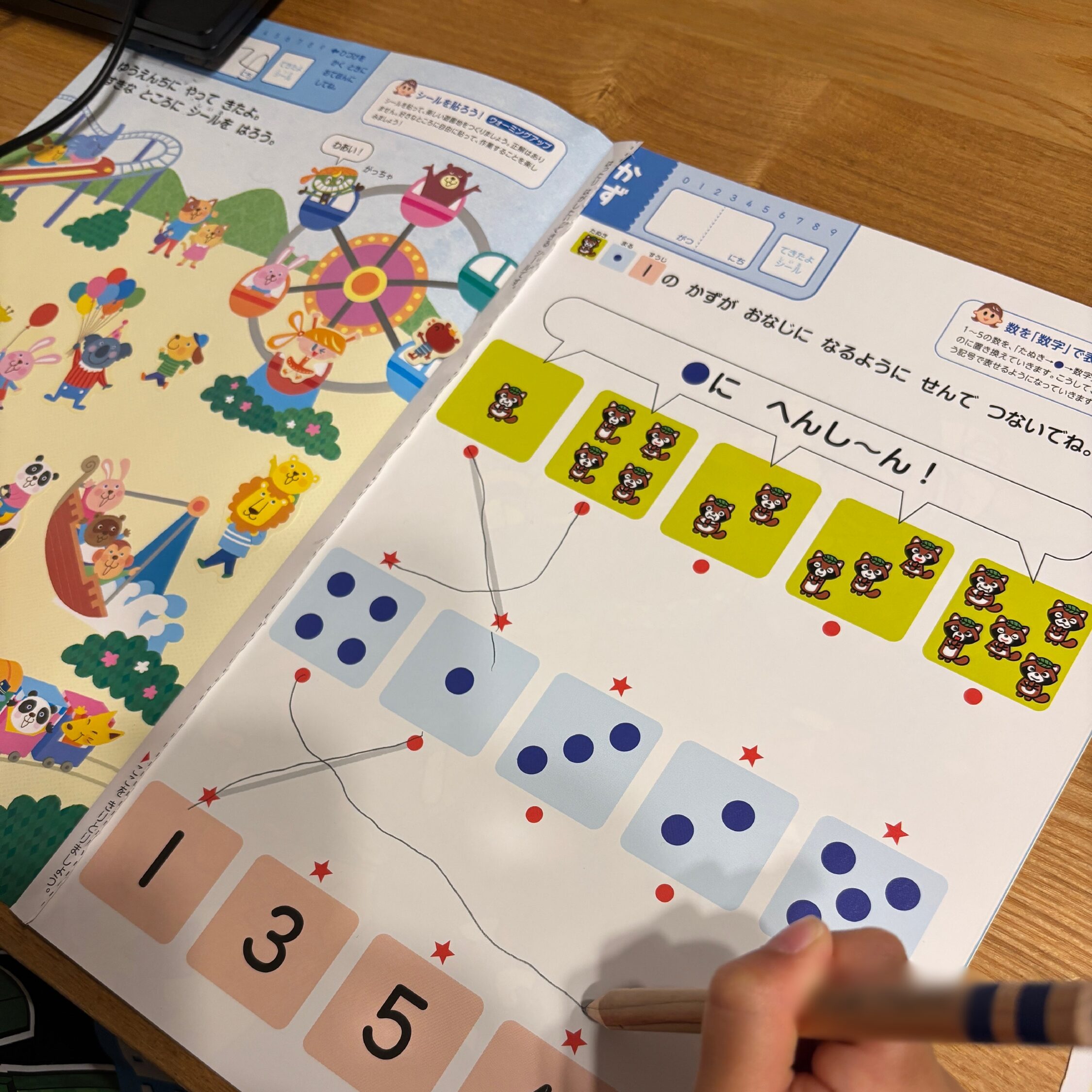 「いかにも勉強!」という感じではなく、遊びの中で数字や文字に親しめるのが年少さんにはぴったりだと思いました。