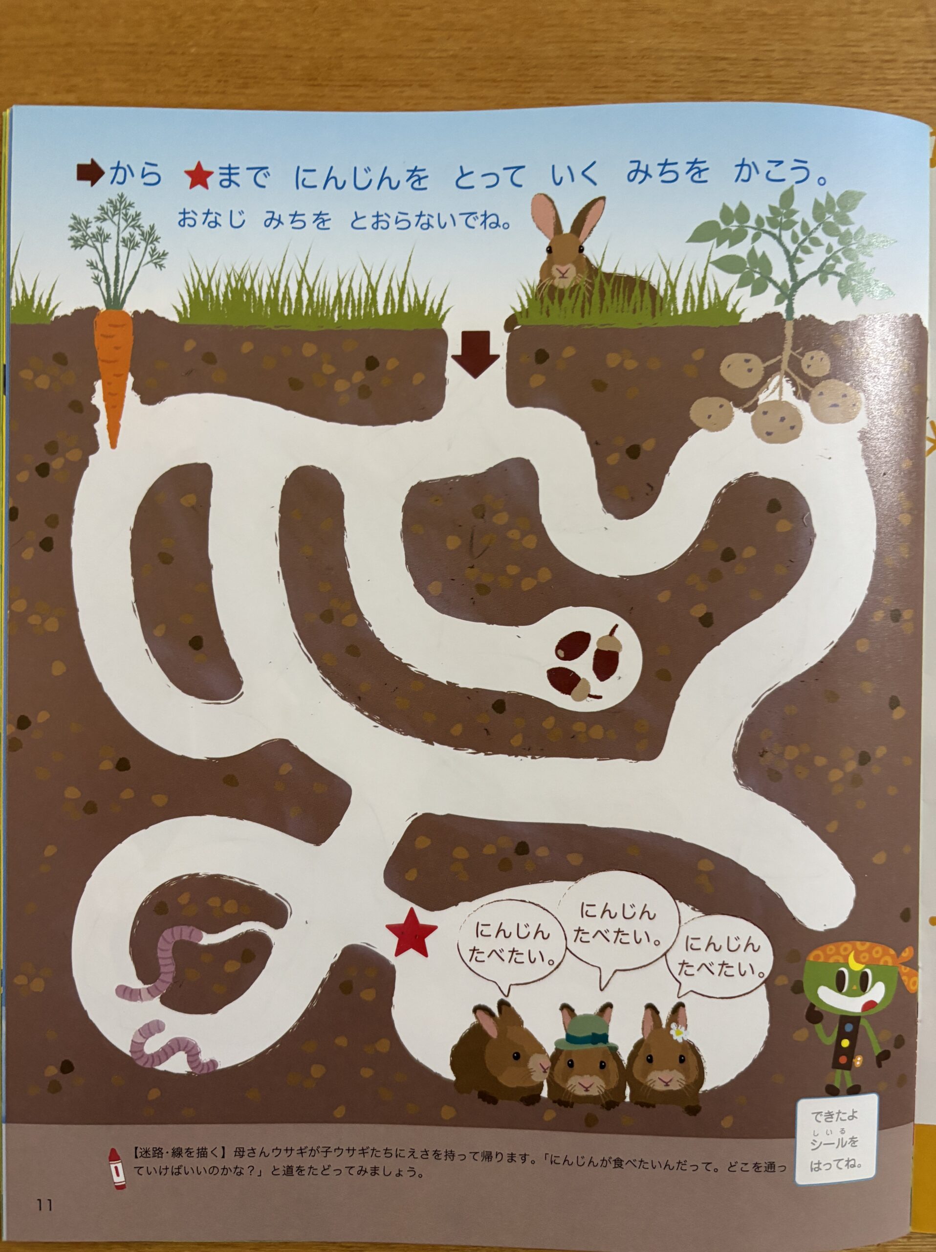 子どもが好きな迷路の中に、数を数える課題が組み込まれていたり、ひらがなも少しずつ登場したりと、遊びながら自然に学べる工夫がいっぱい。