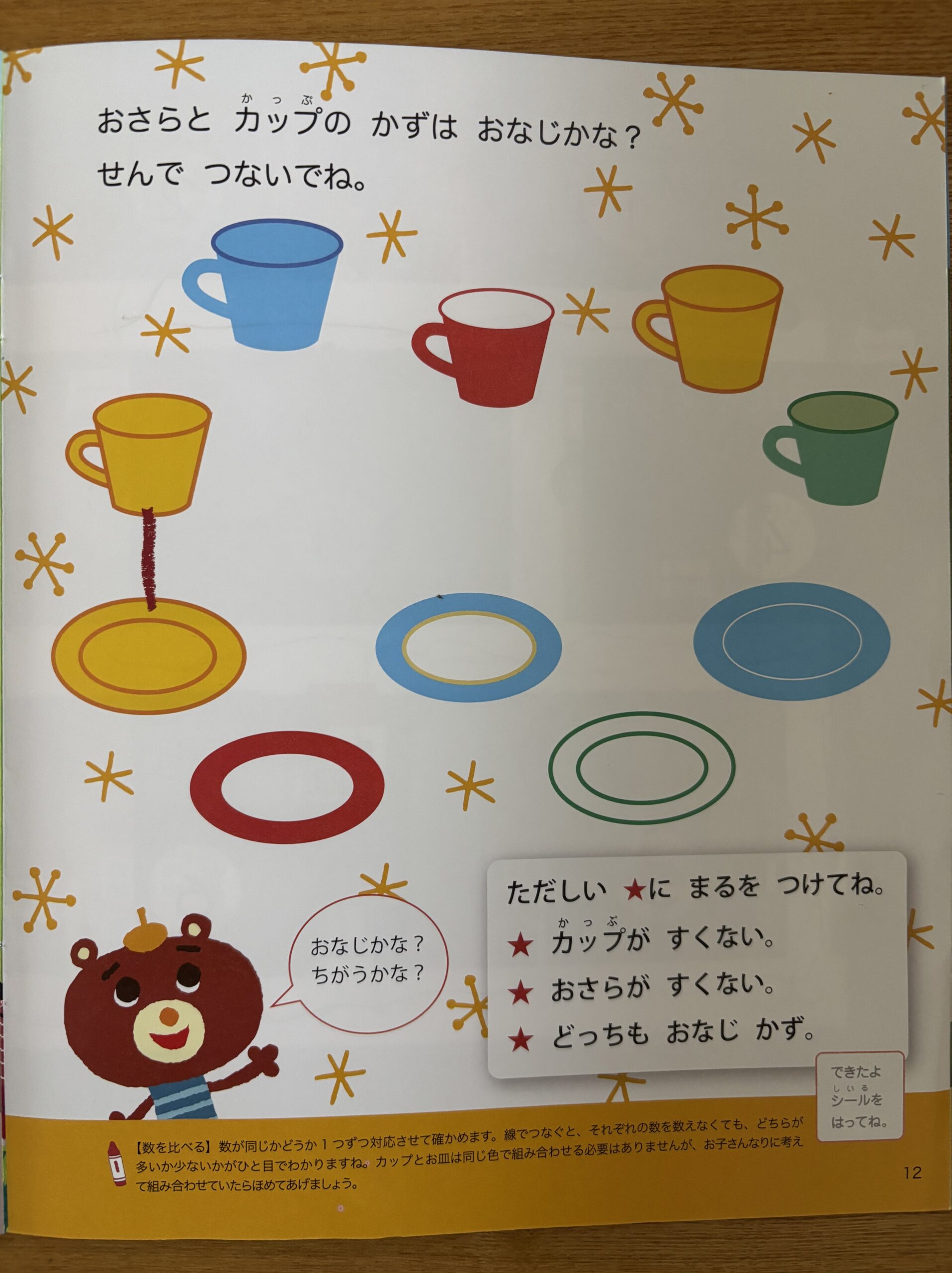次に出てきたのは、イラストやサイコロの目を見て、数を数えたり、線でつなぐページ。