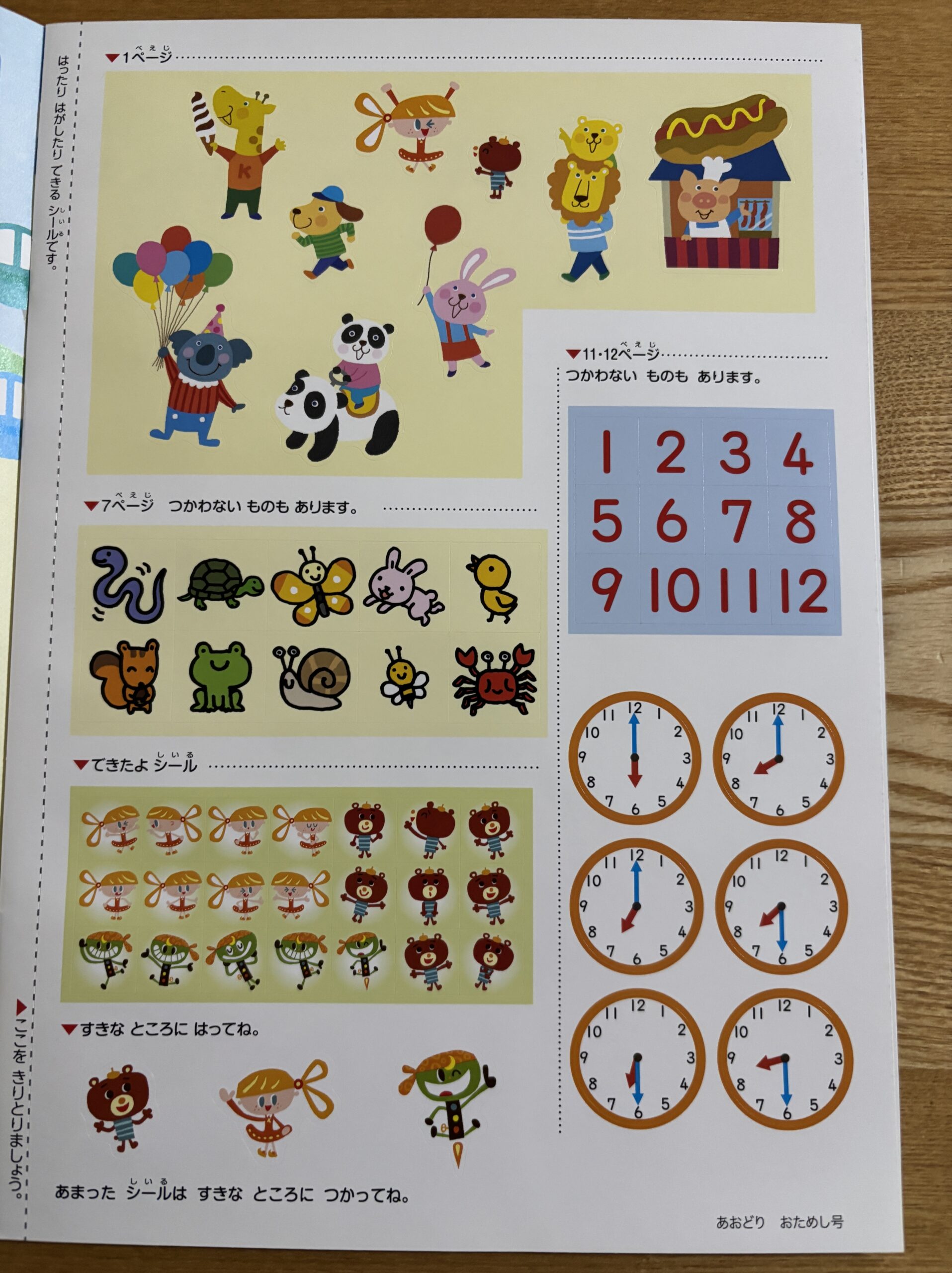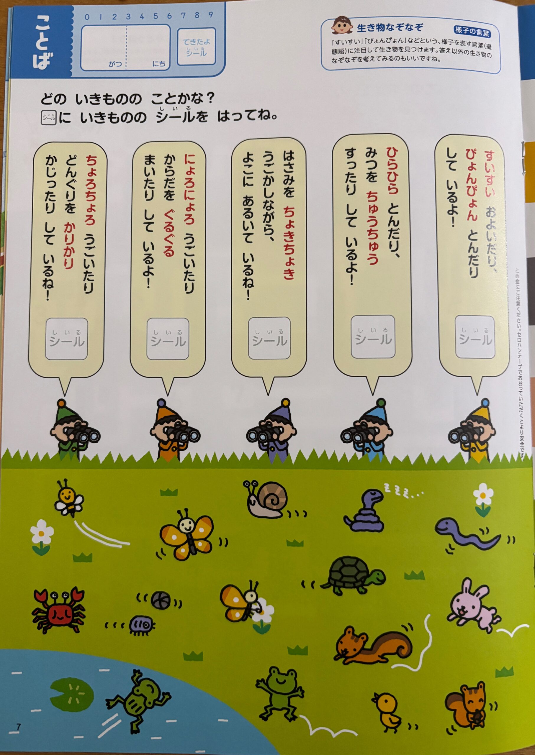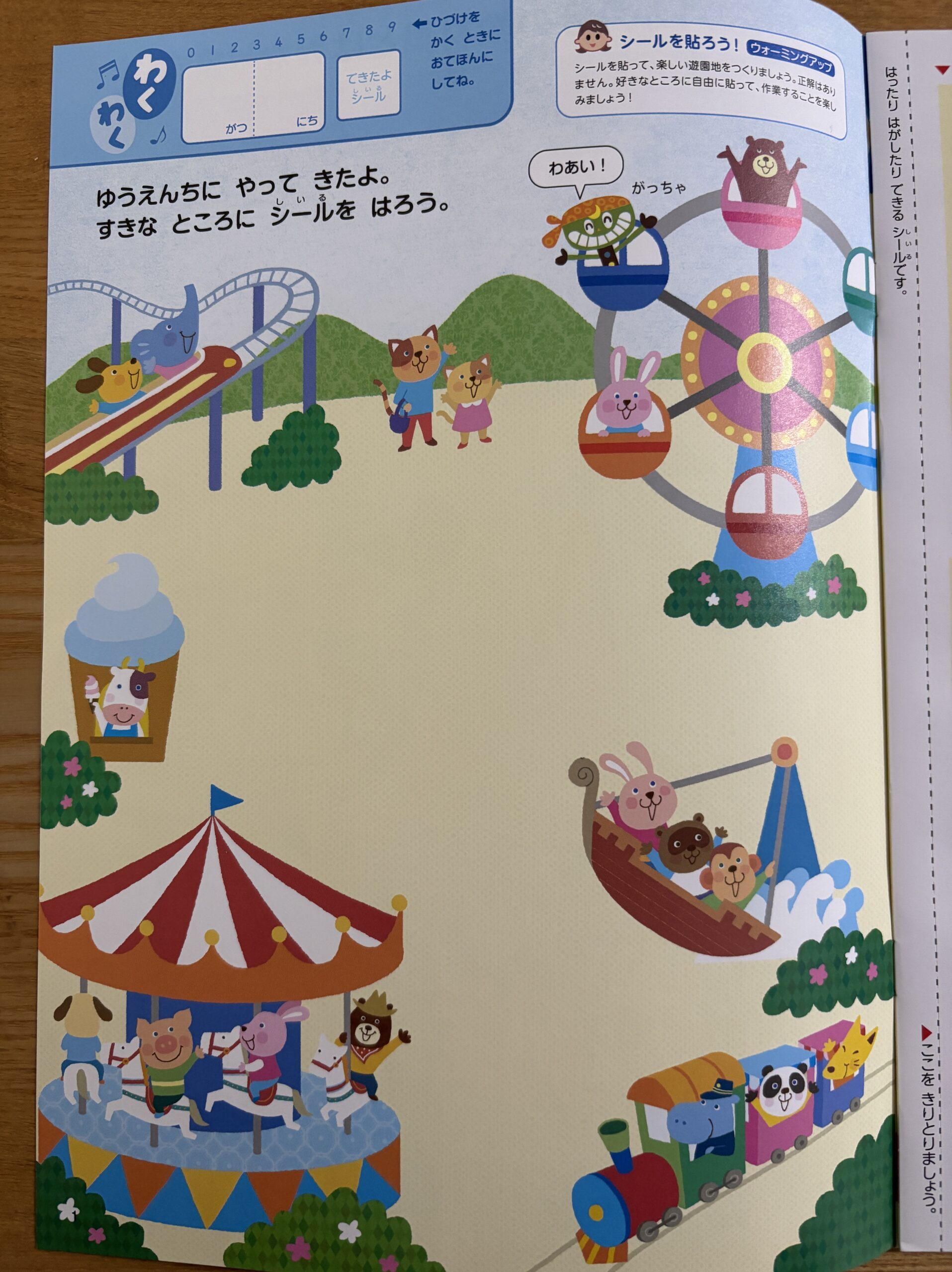 教材のはじめは、動物のシールを好きなところに自由に貼れるページから始まります。