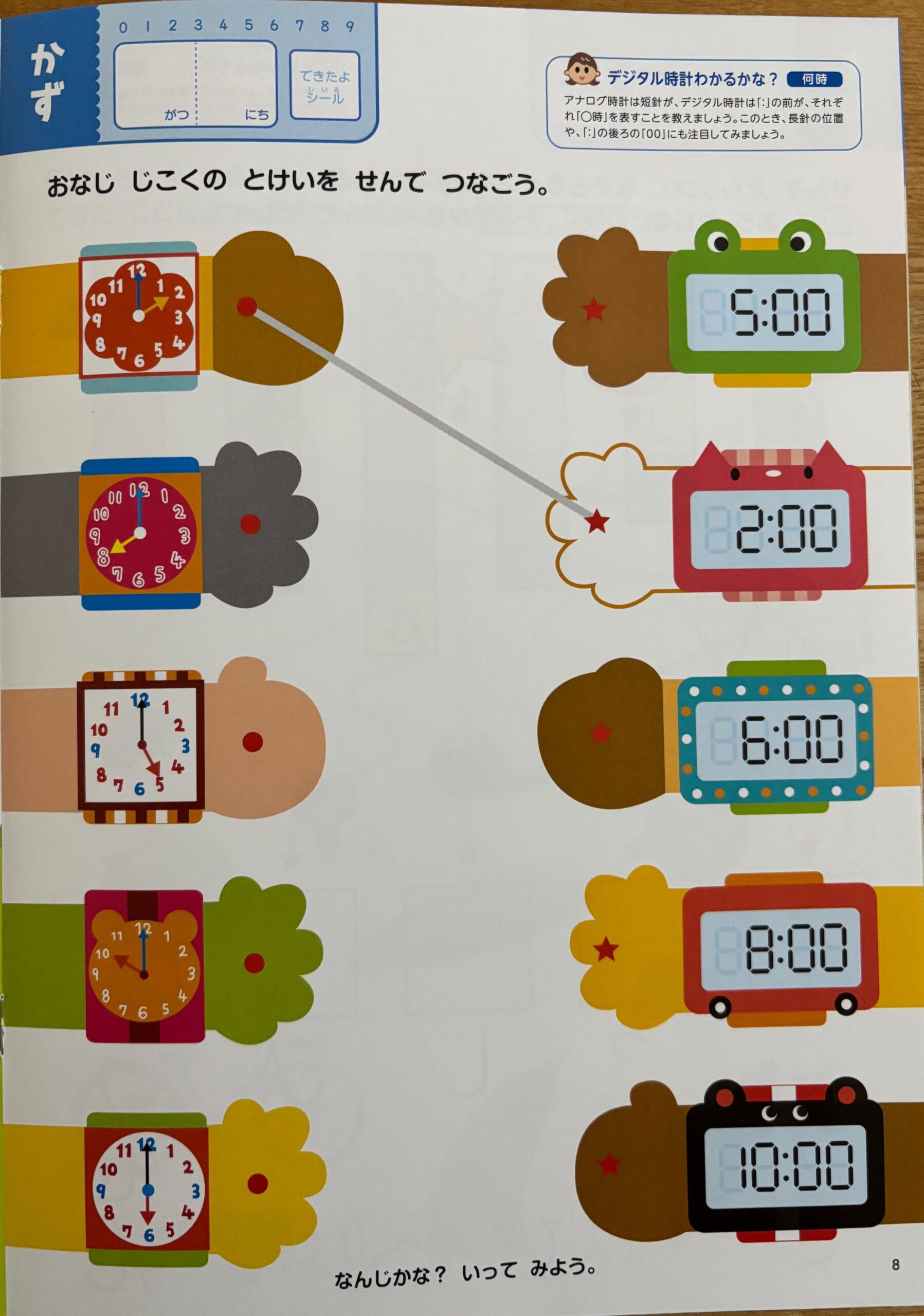 時計の読み方・ひらがなの書き方・数の数え方など、