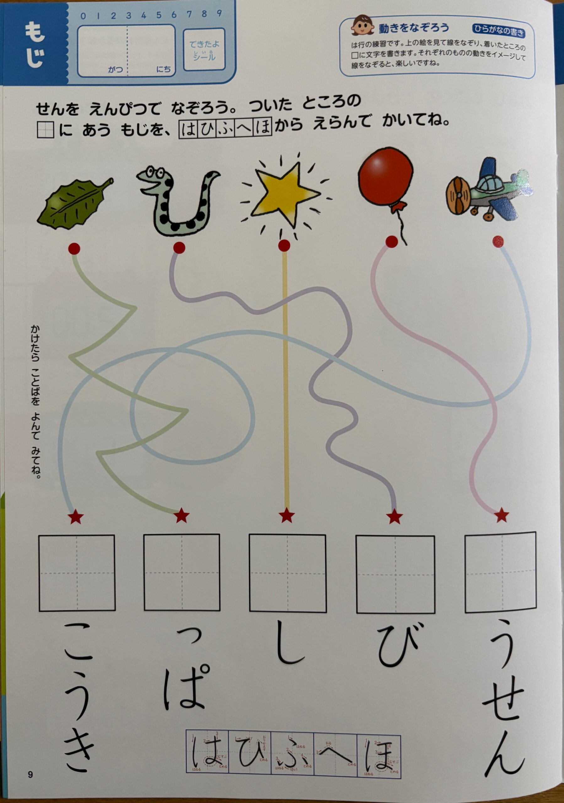 ひらがなの練習ページでは、写真やイラストがカラフルで、ただの「書き取り練習」にならない工夫がされていました。