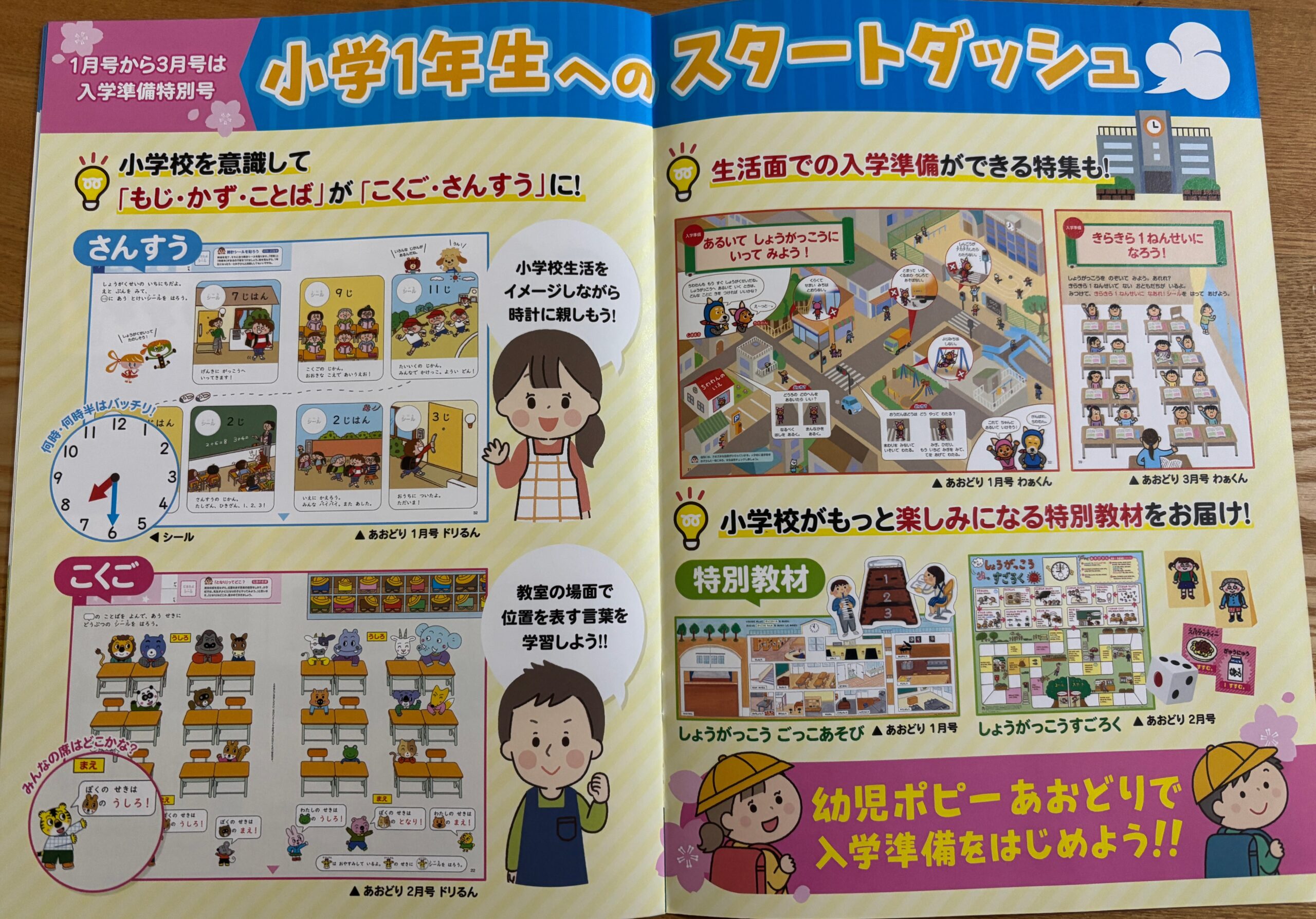 年長さんになると入学準備ができる教材もあります。事前に小学校のイメージを教えられると、子どもも安心できるし入学が楽しみになりますね!