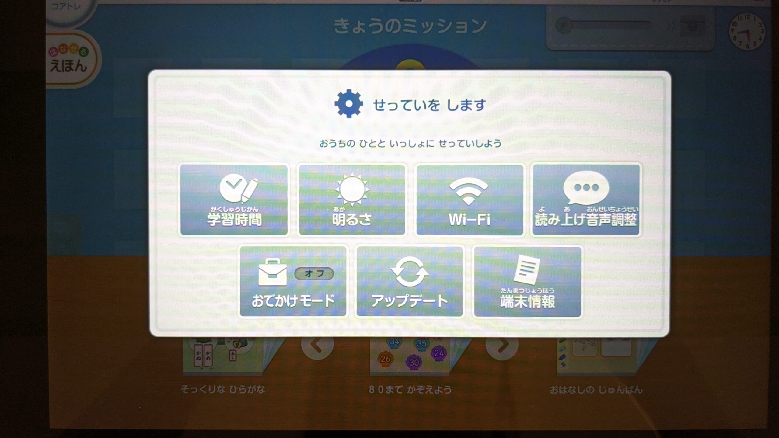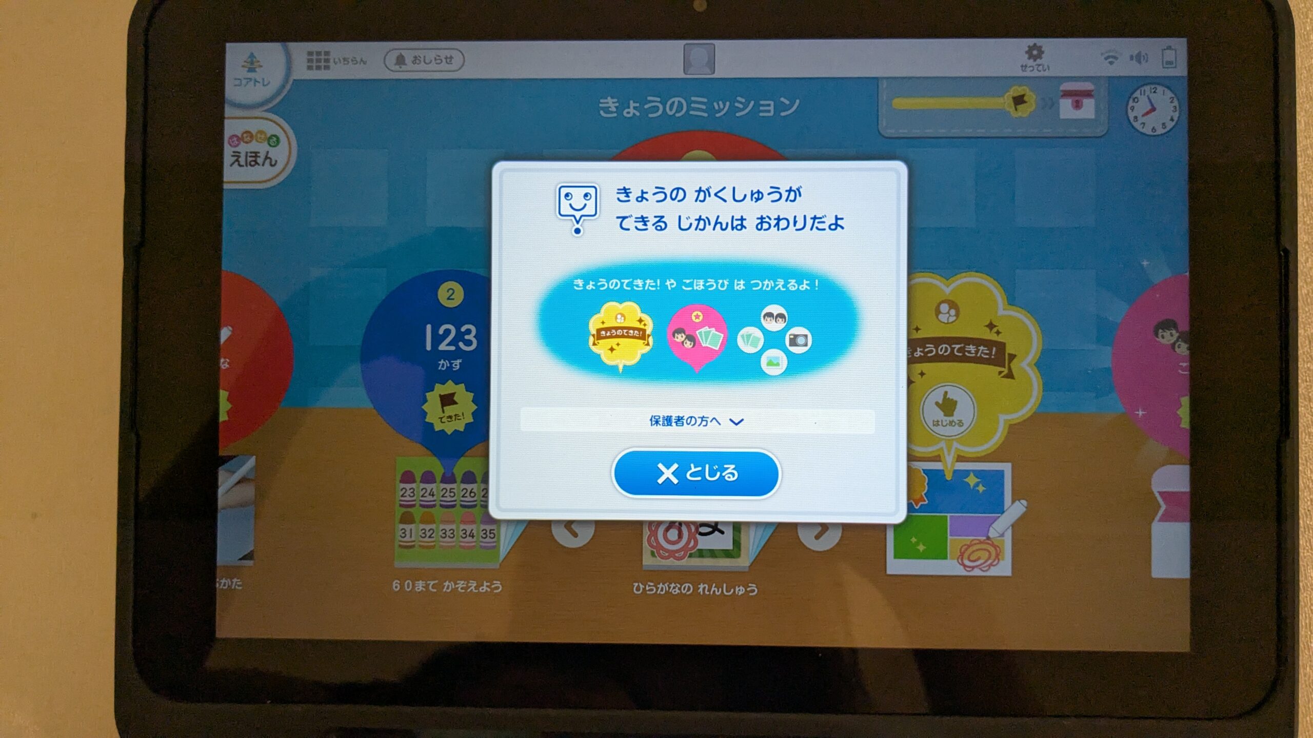 設定した学習時間がすぎると「きょうのできた」や「ごほうび」以外はできなくなります。