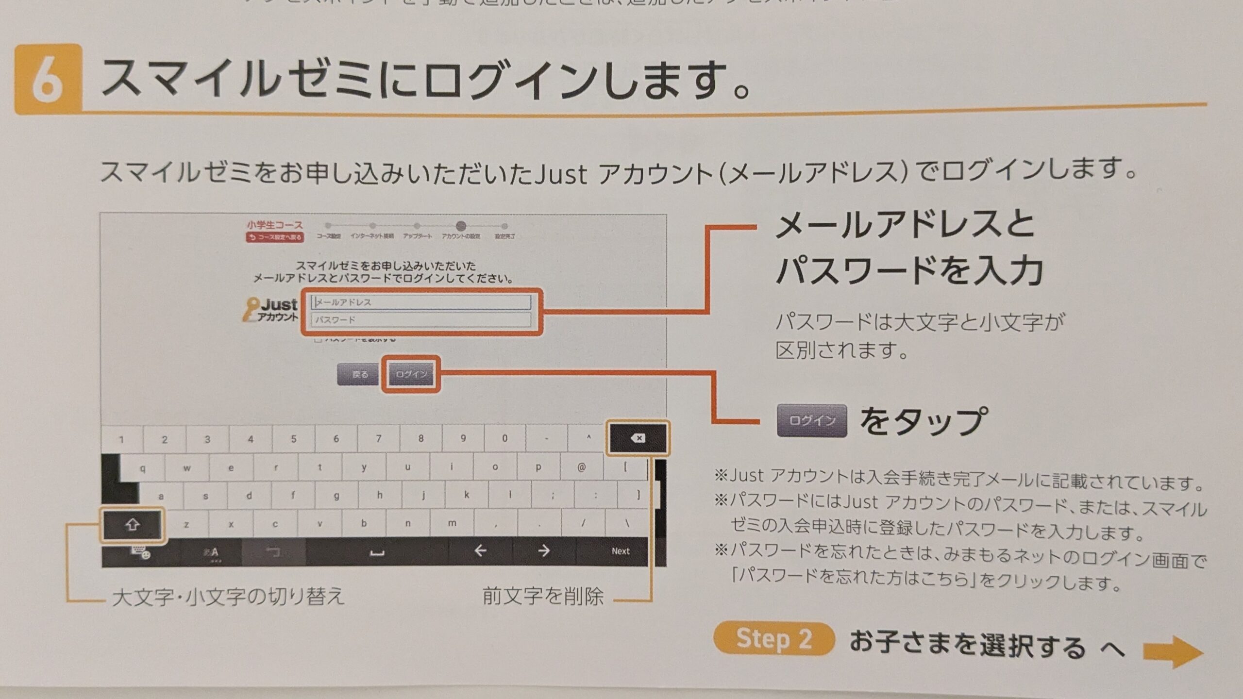 スマイルゼミを申し込んだJustアカウント(メールアドレス)でログインします。